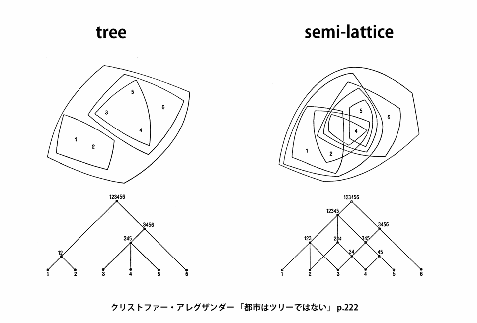 C. アレグザンダー流に言えば、生きた組織は 「ツリー」構造ではなく「セミラティス」の構造を持っています。トップダウン式に全体を統治する「ツリー」は、官僚、警察、軍隊といった組織には通用するかもしれませんが、複数のメンバーが複数プロジェクトに重複して関わる組織や、開かれた地域社会には馴染まず、同様にそれが持つ情報もツリー状に整理するのは難しいと言えます。