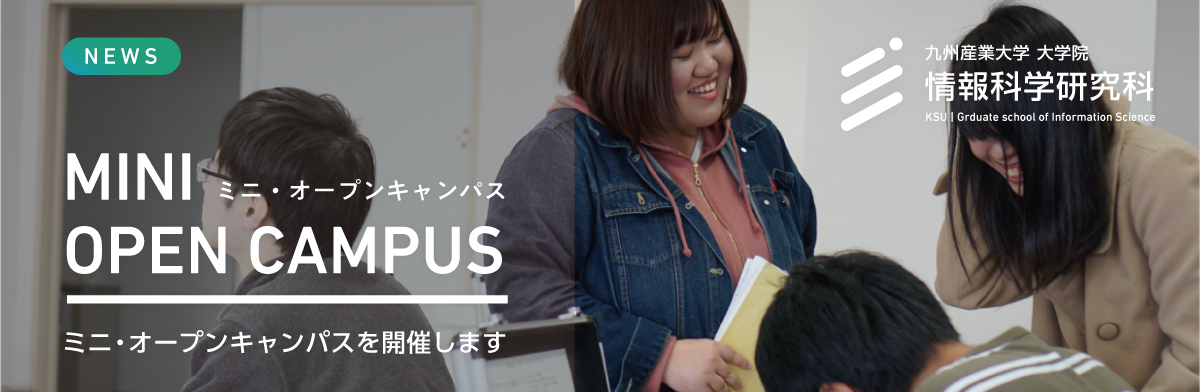 大学院情報科学研究科では、ミニ・オープンキャンパスを開催しています。 「施設見学」「進学相談」「教育研究内容の説明」「指導教員紹介」など、担当教員が個別対応も行います。 文系・理系を問わず、お一人から、友達やご家族と一緒の参加、留学生の方、社会人の方も歓迎します。 開催日前日の午後5時までに、事前予約を行ってください。